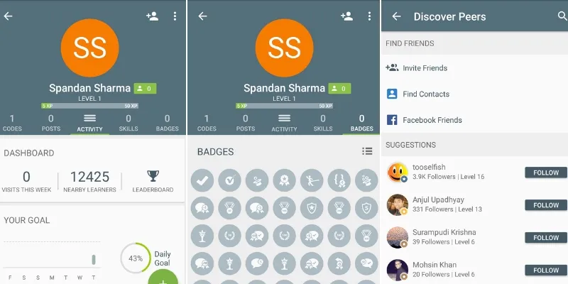 SoloLearn’s home screen is an Activity Feed of updates on the platform (think Facebook News Feed). Here users can see updates from friends, public users, and more.